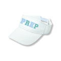 Classic white visor with "PREP" embroidery and blue/white stripe seersucker back strap.