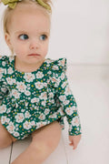 Ollie Jay Leah Romper features a ruffled detail in front and back, long sleeves and a 3 snap closure for easy diaper changes. Pair with our Twirl Dress for matching siblings looks!