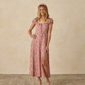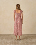 Our Nancy Dress features a flared A-line skirt with a side slit, smocking at the center back, and delicate ruffle details at the neckline and sleeves—finished with a sweet bow at the center front for a charming touch.