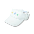Classic white visor with pastel star embroidery and blue/white stripe seersucker back strap.