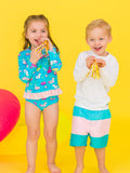 Complete your boy's summer swim outfit with these Swim Trunks. With its inner mesh lining and adjustable drawstrings on the inside, not only will he look good but feel good, too. Made with UPF 50+ sun protective fabric for all day protection and comfort. A classic colorblock, perfect on its own or for coordinating with our Pool Party collection! Pairs perfectly with Pink and Bright Aqua. Care Instructions: Machine wash cold with like colors; do not bleach; do not iron; line dry in shade Fabric Content: 100% Polyester