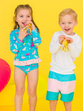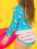 Keep her safe from the sun in this adorable girls' two piece rash guard swimsuit set that features UPF 50+ sun protective fabric. The long sleeves provide extra coverage, while still looking extra cute. Signature rear ruffles add the finishing touch! Unicorn, flamingo, and pineapple floaties drift across a charming retro pool of water! Bright neon colors and fun stars make this pattern perfect for pool parties. Pairs perfectly with Bright Aqua, Neon Magento, Neon Yellow, Neon Orange, Neon Violet, Pink, Bubblegum Pink, and White. Care Instructions: Hand wash cold with like colors; do not bleach; do not iron; line dry in shade Fabric Content: 80% Nylon, 20% Spandex