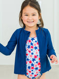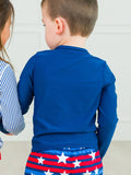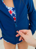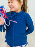 This functional full zip rash guard will keep little ones safe and covered during all types of fun in the sun. High quality UPF 50+ fabric and thoughtful design make this rash guard a must-have for your swim selection. The beautiful navy color makes it easy to coordinate and create an adorable outfit. Care Instructions: Hand wash cold with like colors; do not bleach; do not iron; line dry in shade Fabric Content: 80% Nylon, 20% Spandex