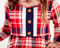 Candy cane wishes and mistletoe kisses! Holiday plaids are a must have!! Made from perfectly breathable viscose from bamboo, meet our all new long sleeve, Graceful Ruffle Dress! Featuring eyelet edging, a coordinating polka dot print, velvet trim, a gorgeous bow back detail, plus all the twirl factor, this dress is nothing short of amazing!