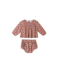 Our Sophia Top & Bloomer Set features a full gathered blouse, balloon sleeves, button backing, and matching bloomers with a ruffle at the waist.