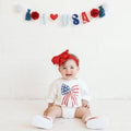 The Patriotic Sequin Bow Patch Short Sleeve Romper is a fun and festive romper for babies celebrating the 4th of July or to show patriotic spirit any day! Features: * Romper Color: White * Patch Color: Red, white and blue sequins with white felt outline * Material: 100% Cotton * Features: Tagless inside neck label for an itch-free wear; 3 snap closure; cuffed sleeves; trendy bubble style * Fit: Infant Unisex * Care: Machine washable, wash inside out, lay flat to dry Each romper is hand pressed with love in our hometown warehouse.